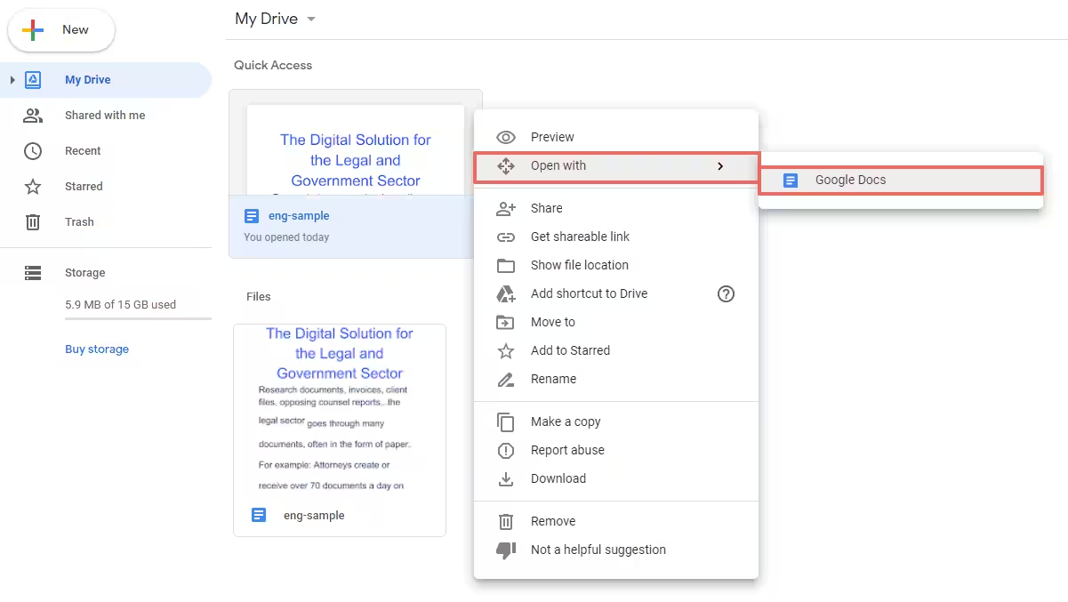 Right-click on the uploaded file and choose Open With > Google Docs.