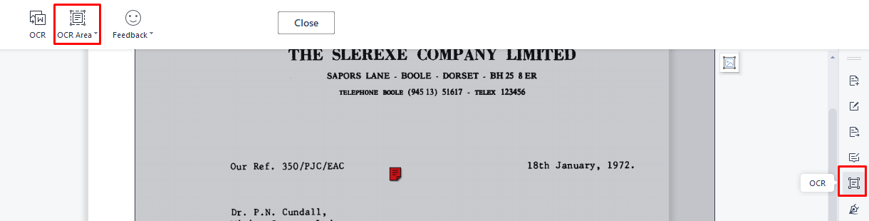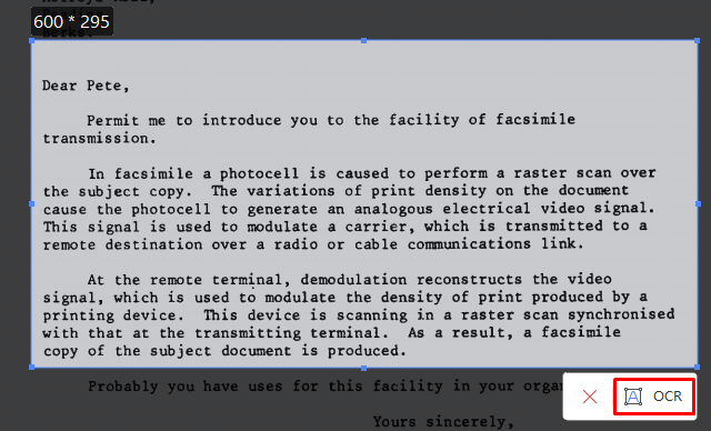 Click on "OCR" and choose OCR Area to select the portion of the PDF to recognize text.