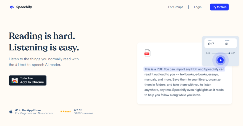 Speechify is an AI-powered PDF text reader that can read any PDF file with natural and expressive voices. It can be uploaded to the Speechify app or website, or used with the Speechify Chrome extension. Users can adjust voice, speed, and pitch, and download audio files for offline listening. Speechify also allows scanning and reading text from cameras or photos.