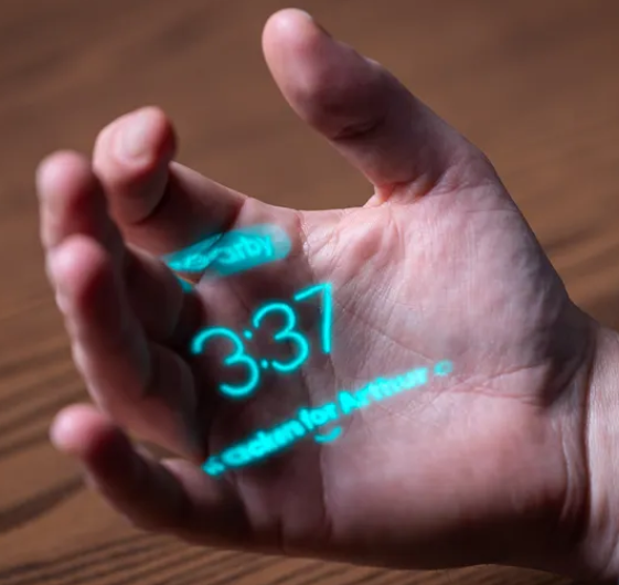 When you tap it and hold your hand out, it projects a blue display onto your palm using lasers. The laser shows menus and text on your hand. You can interact with it by tilting and pinching your hand. It understands 50 languages and can translate speech from another language into English.