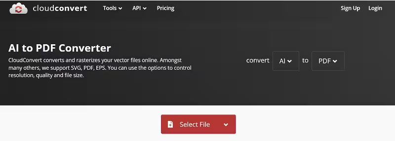Cloludconvert is an online platform that allows you to work with your AI files and convert AI to PDF online free. The conversion file types include but are not limited to PDF, SVG, and EPS. Using this tool, you can also control the quality, resolution, and file size.