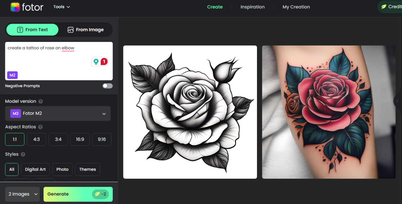 The Fotor AI tattoo generator from text creates custom tattoo designs quickly and easily. It offers various options like black tattoos, text designs, and more. You can choose from a wide range of images without searching through social media platforms. This AI image generator lets you preview and adjust your design until you’re happy with it. With over 100 fonts available, you can create unique textual tattoos in less than a minute. It’s user-friendly and works on both computers and mobile devices for convenient tattoo creation.