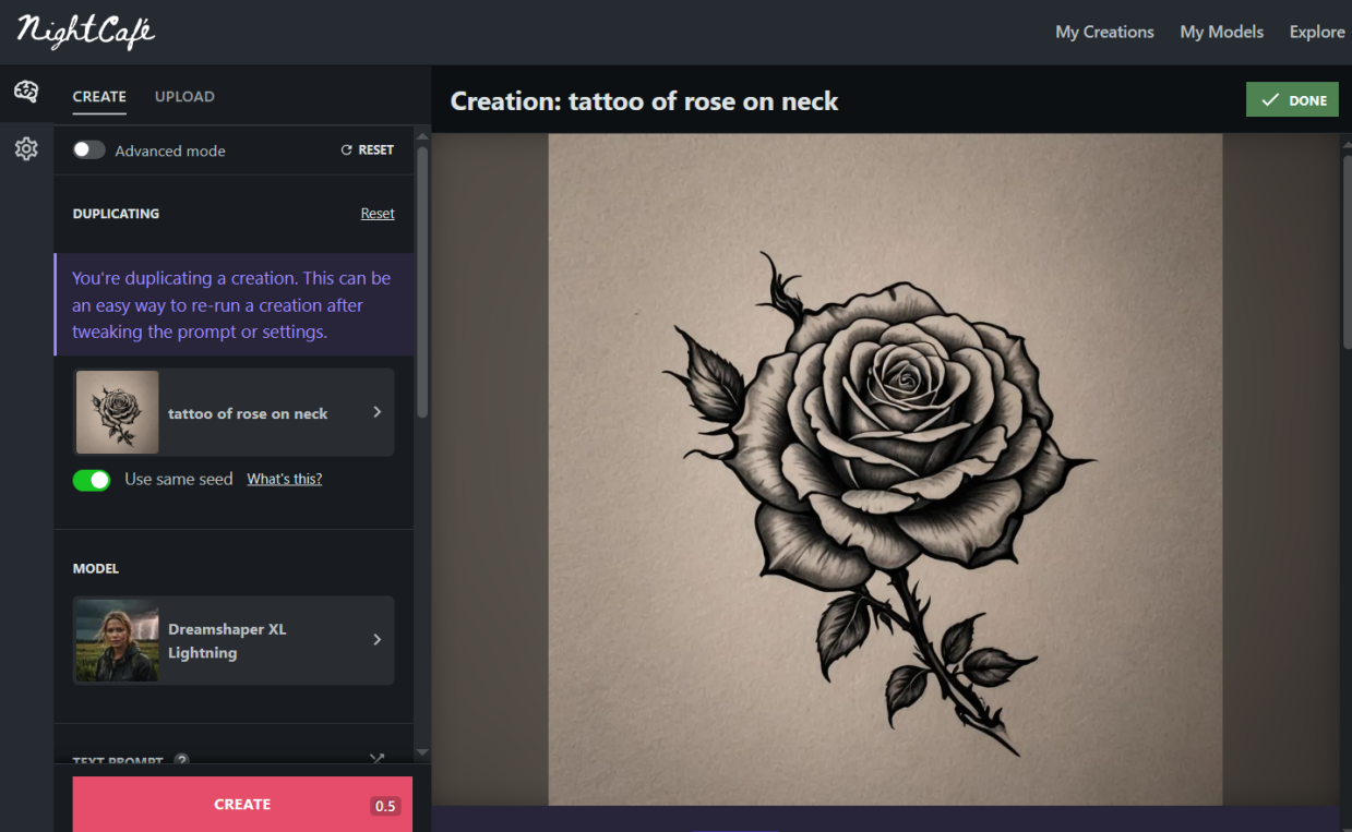 NightCafe AI tattoo sleeve generator uses AI to turn your ideas into stunning tattoo designs. The platform has various AI tools like Stable Diffusion and Neural Style Transfer. You can explore a vast collection of AI-made tattoos, from classic to modern styles, and customize your designs by style, complexity, and color. Moreover, you can join a lively AI art community, make art with pals, and join daily art challenges. Nightcafe also enables you to create art on your computer, tablet, or phone, and check it out from anywhere.