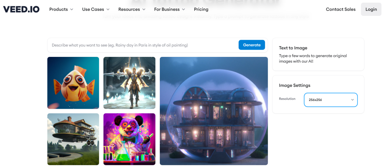 VEED.IO’s image generator from text allows you to give prompts to create unique designs from them instantly. It offers different styles like delicate lines, vibrant colors, or meaningful symbols. You can set image resolution or download images and tweak them to make your dream tattoo. Besides, it’s not just for tattoos. VEED.IO also comes with voiceover features and helps you make professional videos with features like text-to-video and templates.