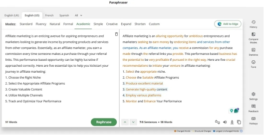 QuillBot is a popular AI writing tool for content creation. It’s known for its advanced natural language processing (NLP) features and comes with a “Paraphraser” that can rewrite text to improve quality and fit different tones like friendly, professional, or casual. Quillbot does more than just replace words. It identifies synonyms and restructures sentences, making certain the rewritten text is fluent and clear.
