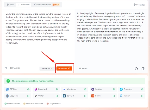 Click "Humanize" to Humanize AI Text and then you will get undetectable output