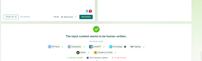 The AIHumanizer AI Detector flagged 50% of the content as AI-generated, indicating a less-than-satisfactory performance. This substantial misclassification (50%) can likely be attributed to the detector’s difficulty in distinguishing nuanced, human-like phrasing that often resembles AI-generated text. Such errors highlight the tool’s limitations in accurately assessing the authenticity of diverse writing styles, which can lead to unnecessary confusion and misinterpretation among users relying on its assessments for critical evaluations.