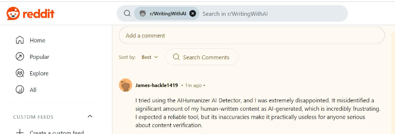 Here is some genuine user feedback from Reddit, where a user recounted their experience with the AIHumanizer AI Detector. They reported being extremely disappointed, stating that the tool misidentified a significant portion of their human-written content as AI-generated. This misjudgment led to frustration, highlighting concerns about the tool's reliability.