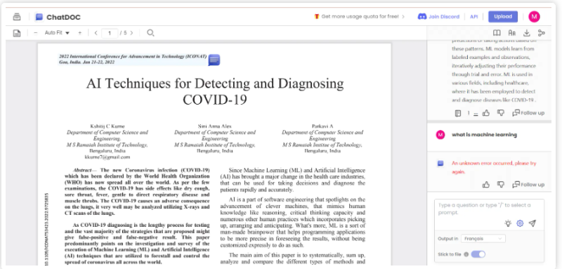 Since ChatDOC supports multiple languages, I decided to ask the same question and answer it in French. However, an error message was displayed.