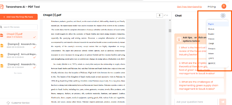 Tenorshare AI ChatPDF stands out as an impressive alternative to ChatDOC, particularly for those focused on detailed PDF summarization, intelligent Q&A, and multilingual support. This tool provides efficient handling of multiple documents simultaneously, making it highly valuable for users managing extensive research materials. Tenorshare Chat PDF is the best and reliable option where you can instantly summarize.