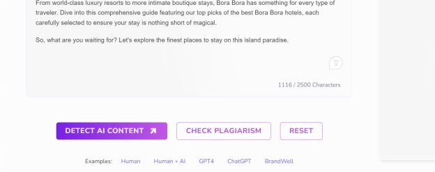 Content At Scale AI features a proprietary tech stack that works more in-depth than the generic AI classifier. It’s capable of detecting content from ChatGPT, Gemini, Claude, and various other AI models. The best part? It's quite user-friendly; you will only need to paste the content and hit DETECT AI CONTENT to perform detection in no time.