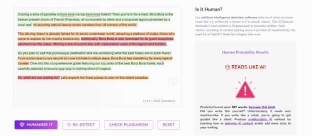 - Now, you can HUMANIZE IT, RE-DETECT, CHECK PLAGIARISM, or RESET the box per your preference.