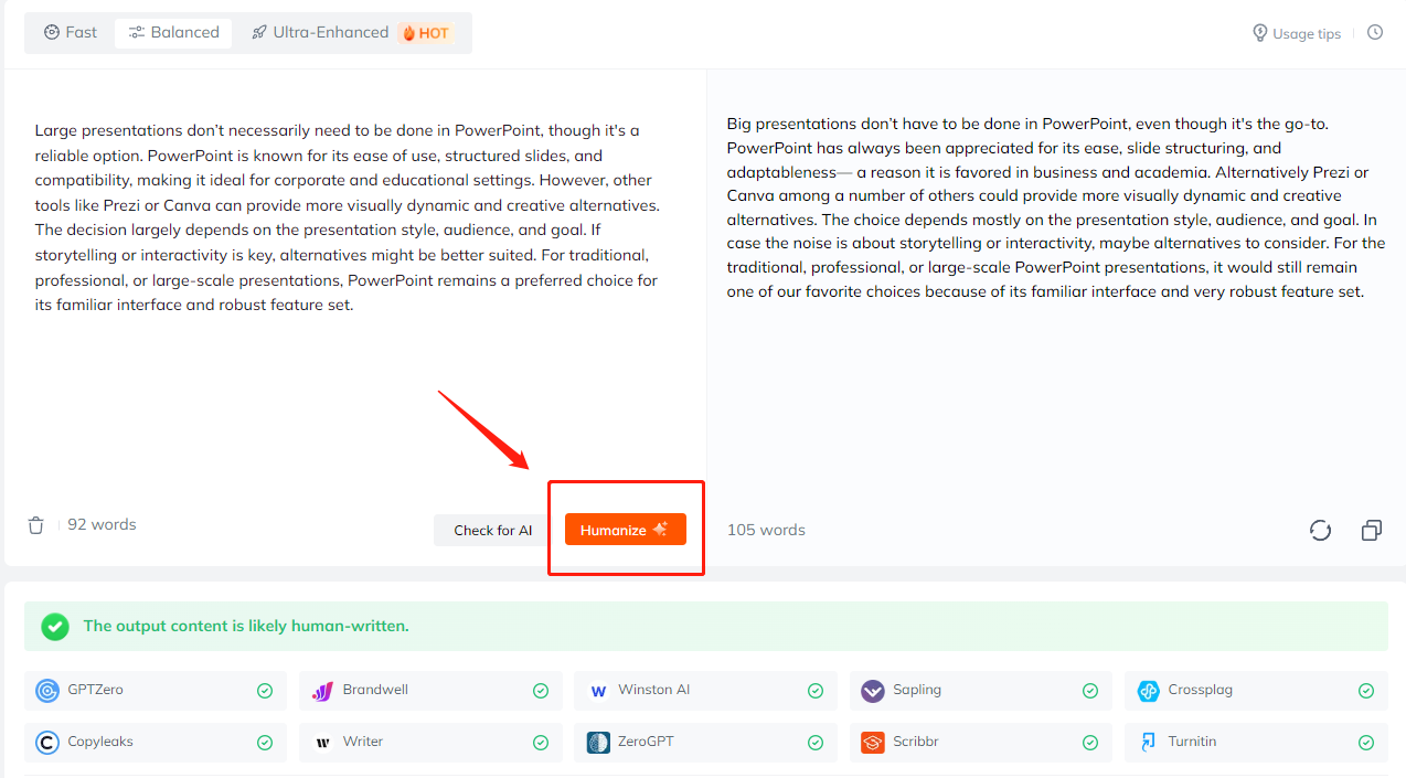 And paste the text, hit the button, and it rephrased the content into human-like language.