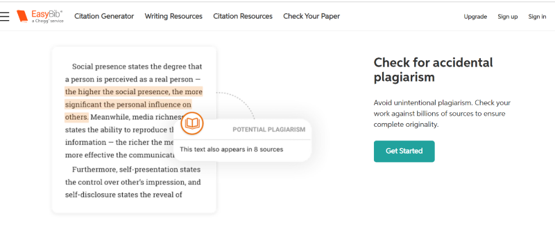 EasyBib is best known for its citation generation tools, allowing users to easily create citations in various styles such as APA, MLA, and Chicago. Unfortunately, its plagiarism checker, which is intended to complement its citation services, leaves much to be desired. Many users find that EasyBib Plagiarism Checker focuses more on generating citations than genuinely helping users detect and avoid plagiarism.