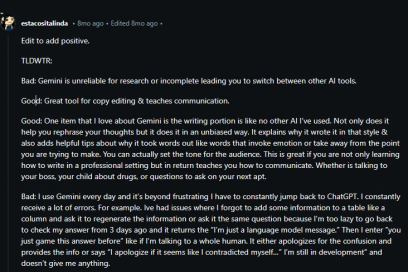 One of the major positive aspects of Google Gemini is how well Google integrates the tools and workspace. Users highly appreciate this platform because it relies on the Google ecosystem. People are also excited about Google Gemini, which can handle multimodal data such as images and texts.