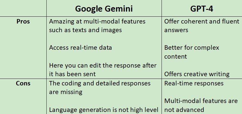 Below, we have mentioned some of the major pros and cons of Google Gemini vs GPT-4 documents that will help you understand which one is better for you.