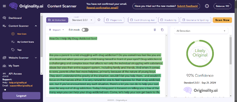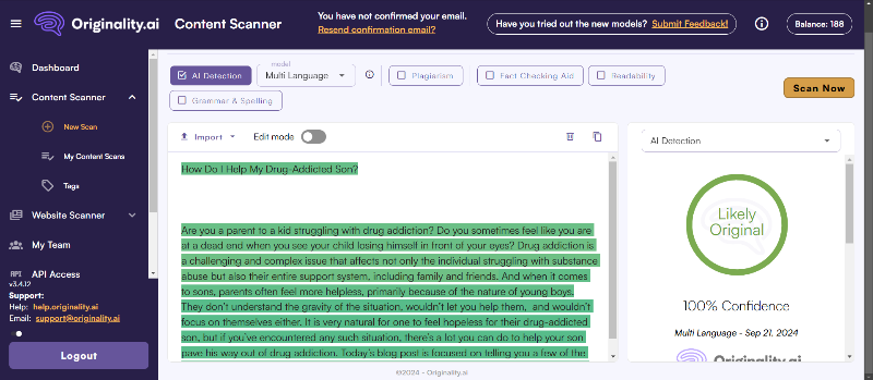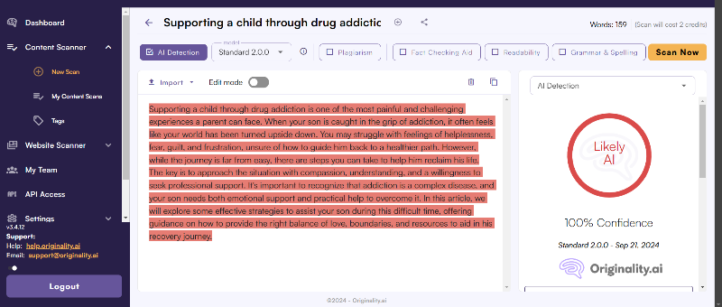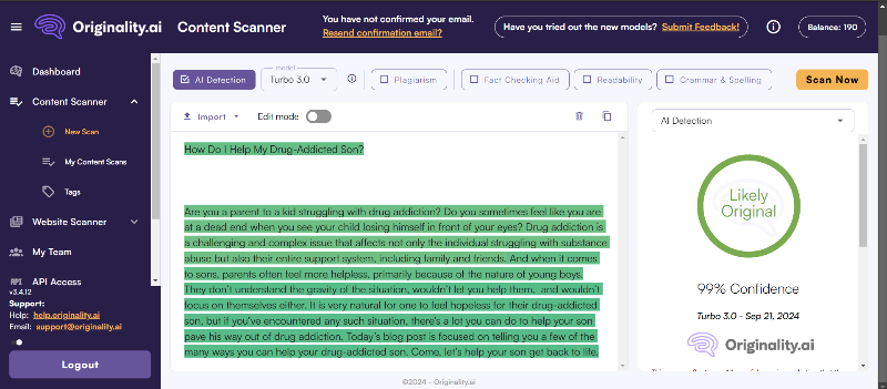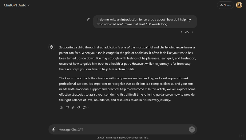 I was writing a blog post about “how do I help my drug-addicted son,” so I decided to use it to test the real originality of this detector. First, I asked ChatGPT to come up with an introduction for the article, and here’s what ChatGPT gave me: