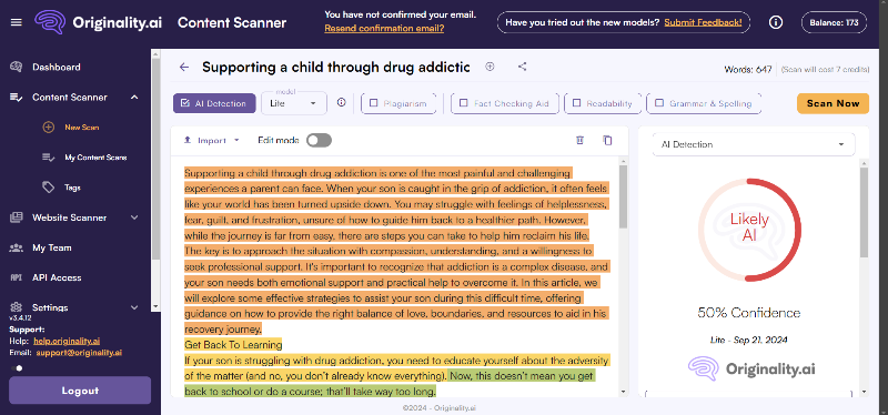 Originality AI is one of the leading free online AI text detectors, which gives you the likelihood of a text being human-written or AI-generated. However, what makes it special is that it is a complete content quality checker tool that you can also check for plagiarism using this tool.