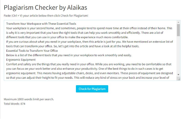 Plagiarism Checker Alaikas is a free, user-friendly tool designed to help individuals and content creators ensure their work is original. It supports up to 1000 words per check and requires no registration. Here, you will find a lot of other features such as article writing, grammar and spelling checker, word counters, and so many different features.