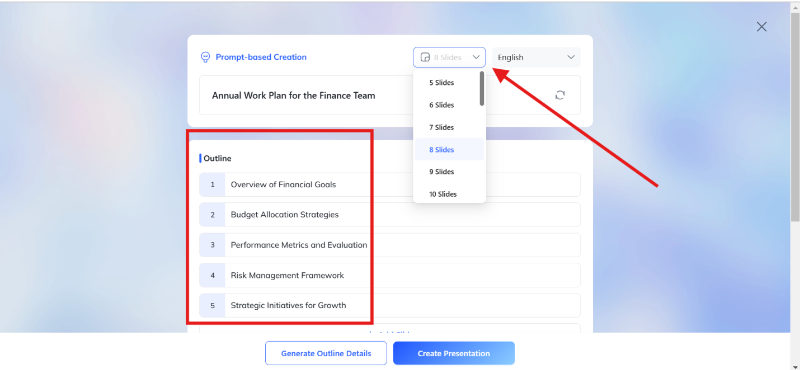 Choose how many slides you need—whether it’s a short 5-slide summary or a detailed 20-slide presentation. Click the “Generate” button, and the AI will create a professional presentation in seconds.