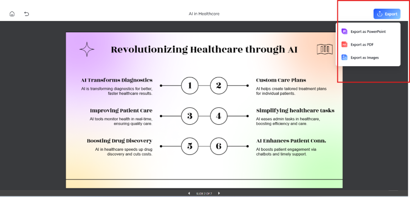Preview your slides to ensure they look and flow as expected. Once satisfied, export the presentation in your preferred format (e.g., PowerPoint or PDF).