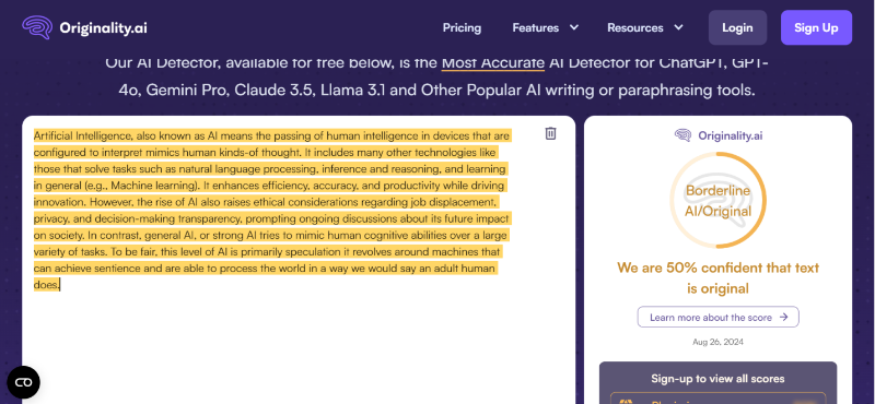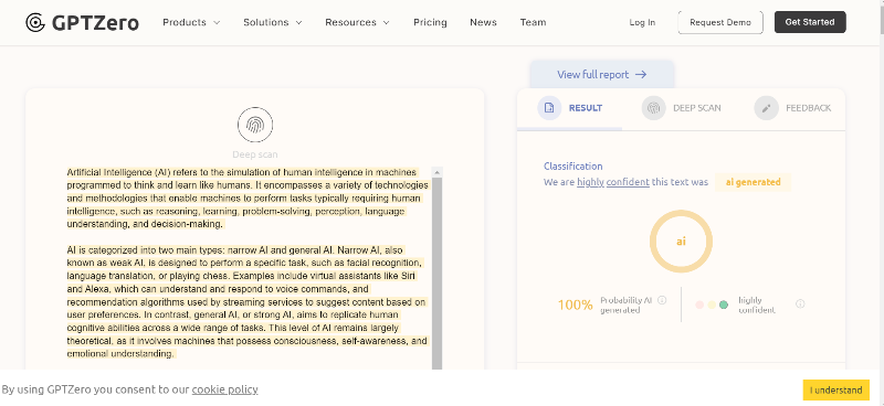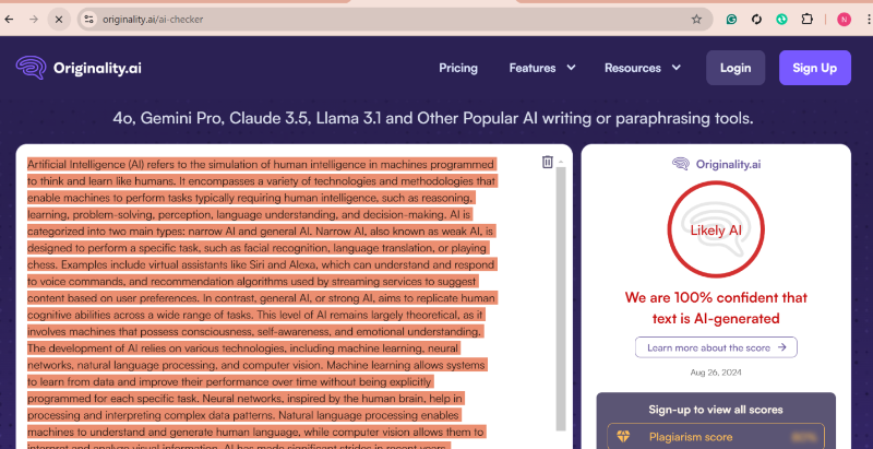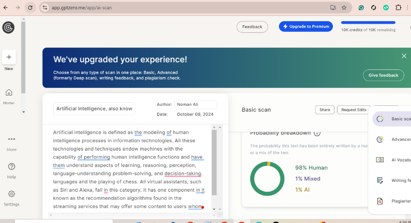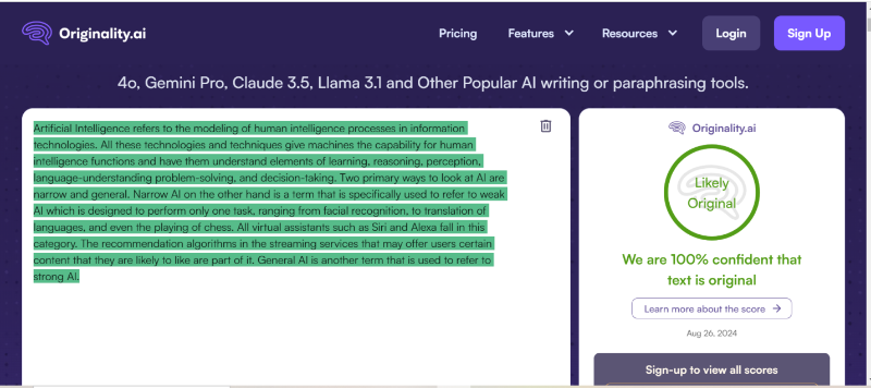 - Hybrid NLP Algorithms: Leverages a combination of natural language processing (NLP) and machine learning models for nuanced detection of AI-written text.