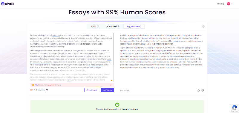 Humanization Technology Claim: uPass aims to make AI content appear more human-like. | Unnatural Writing: Content often feels awkward and lacks the flow of natural writing. |