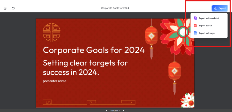 Before exporting, preview your slides to confirm the content, design, and flow meet your expectations. Once satisfied, export your presentation in your desired format, such as PowerPoint or PDF, and get ready to present your plan effectively.