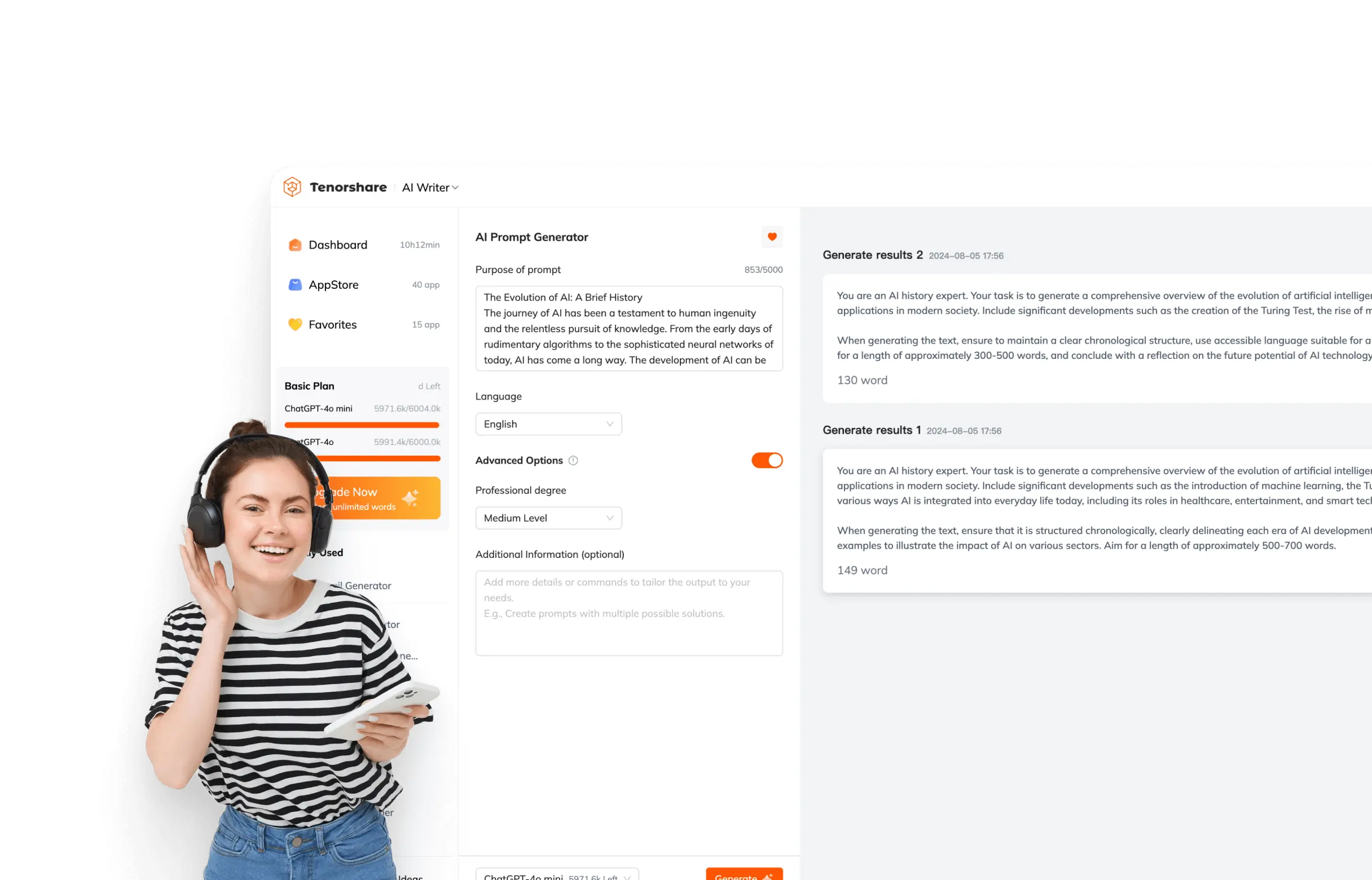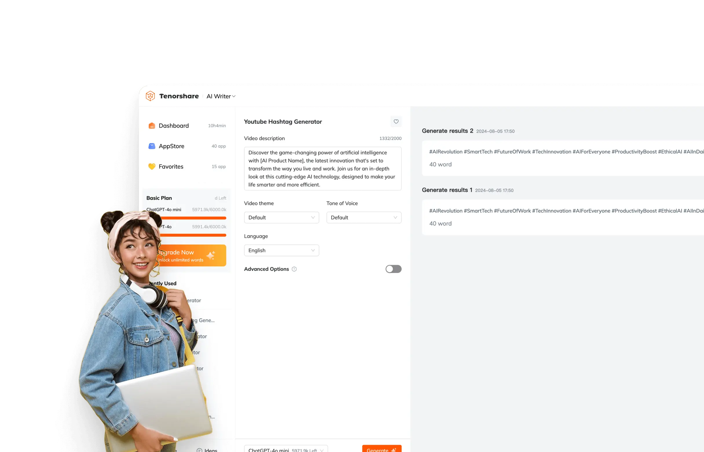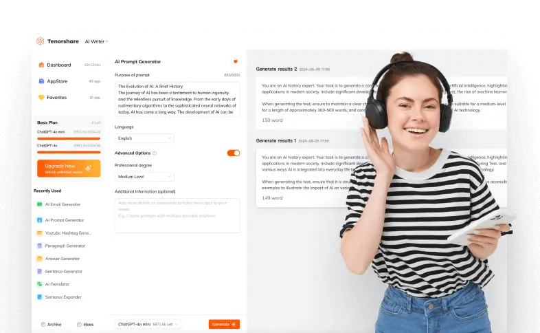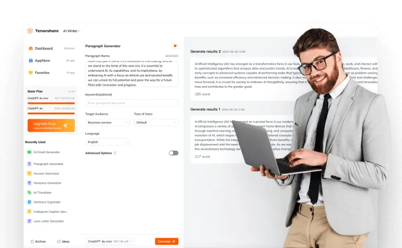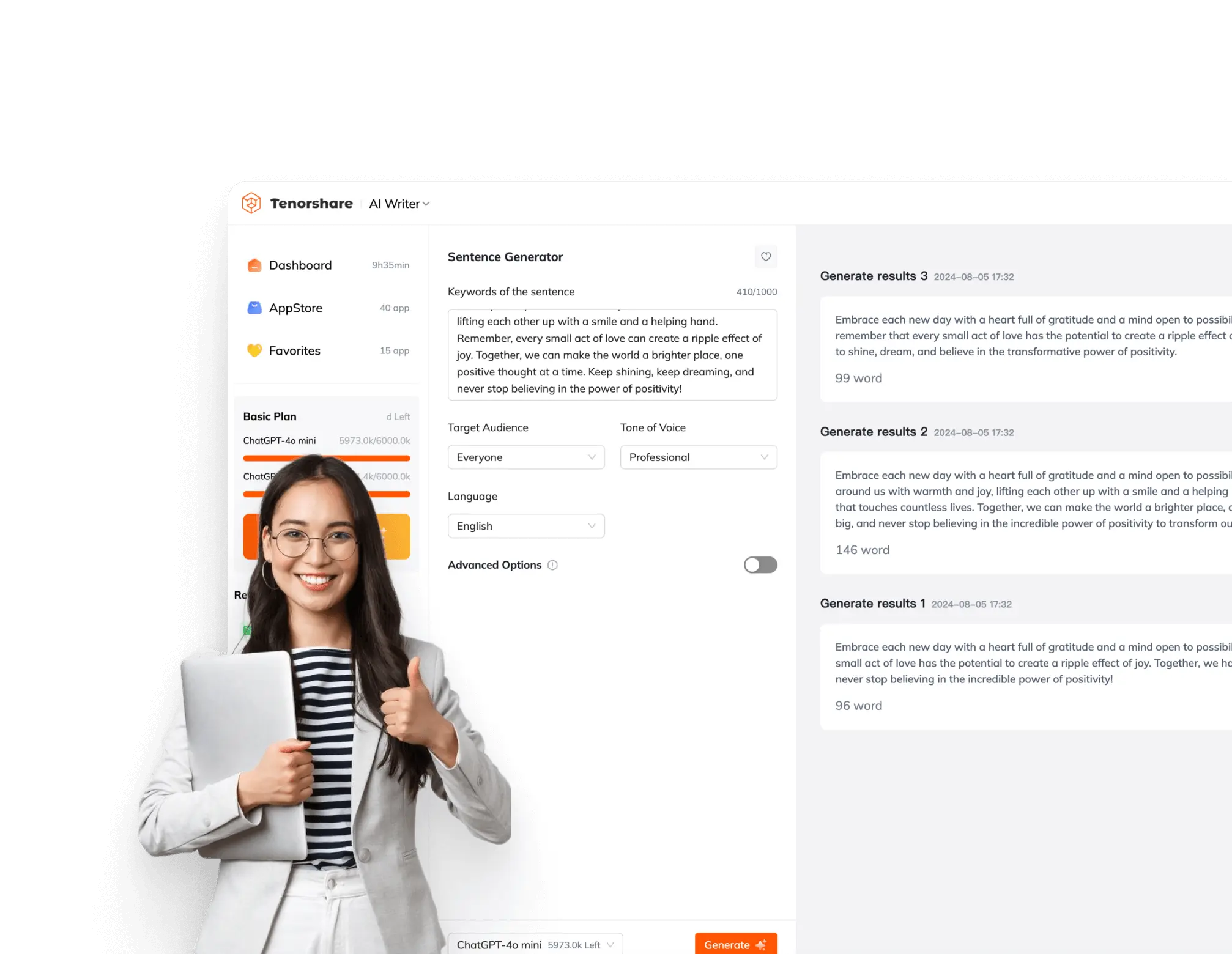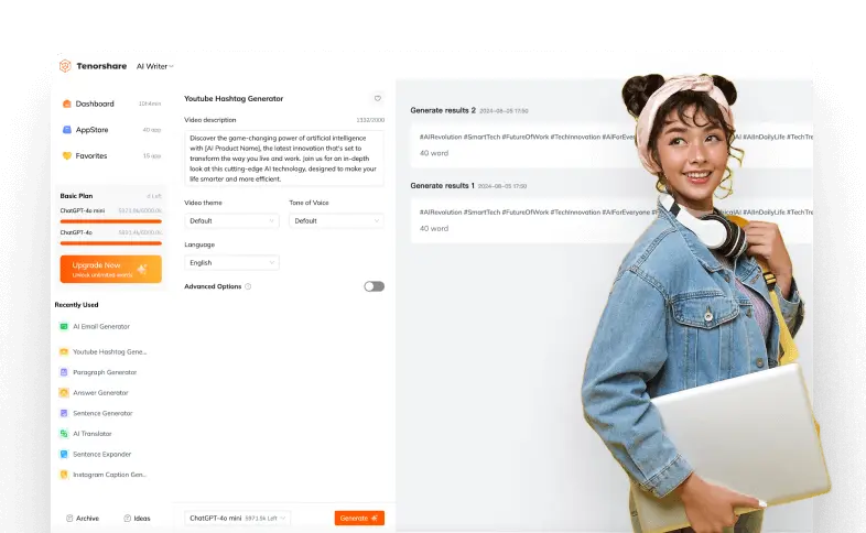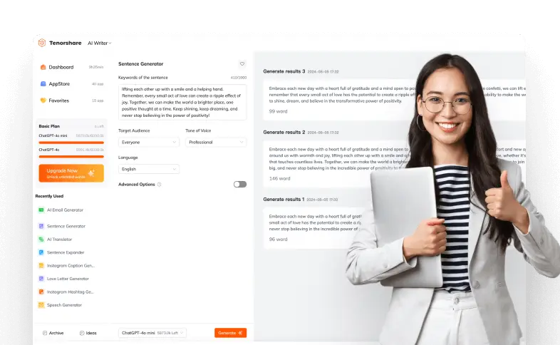 Tenorshare AI Writerで、パーソナライズされた高品質なコンテンツを無制限に作成できます。SNS、マーケティング、広告などに最適です。