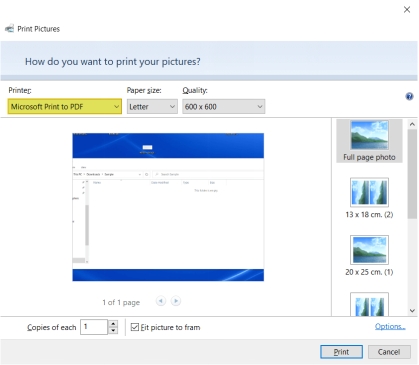 If you want a free option to convert PNG to PDF on Windows use the system’s embedded feature “Microsoft Print to PDF.” Here’s how to convert PNG to PDF with “Microsoft Print to PDF:”